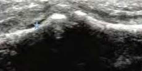类风湿关节滑膜炎症会导致滑液渗出不断增多,形成关节腔积液。肌骨超声少可发现1ml的积液,能对关节腔积液量及位置准确定位,通过检测判定关节腔内液性边界清楚的无回声区、细点状回声或细微的低回声条纹,判断其宽度和深度衡量积液量的多少,进而评估RA的严重程度。