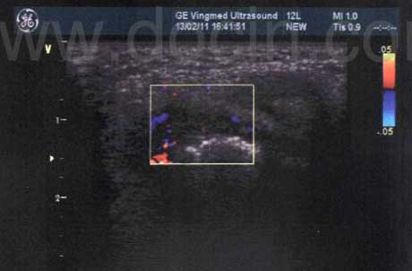 滑膜内异常血流信号:丰富的网状及树状血流信号
